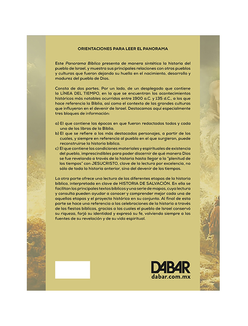Este Panorama Bíblico presenta de manera sintética la historia del pueblo de Israel, y muestra sus principales relaciones con otros pueblos y culturas que fueron dejando su huella en el nacimiento, desarrollo y madurez del pueblo de Dios. Consta de dos partes. Por un lado, de un desplegado que contiene la línea del tiempo, en la que se encuentran los acontecimientos históricos más notables ocurridos entre 1900 a.C. y 135 d.C., a los que hace referencia la Biblia, así como el contexto de las grandes culturas que influyeron en el devenir de Israel. La otra parte ofrece una lectura de las diferentes etapas de la historia bíblica, interpretada en clave de historia de salvación. Valioso instrumento de trabajo para quienes explican o estudian la Biblia, tanto para principiantes como para avanzados.